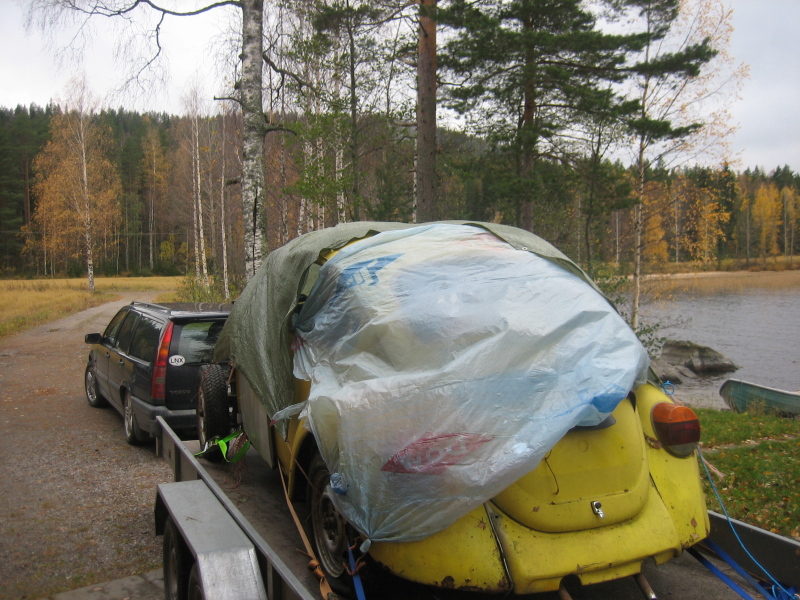 Volvon perä on hieman matalalla vahvistetuista kuormajousista huolimatta: Takakontissa on Kuplan 'varakone' ja iso läjä osia.